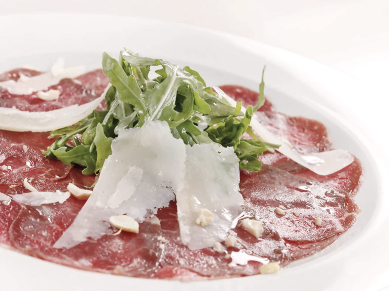 Finely sliced raw artichoke hearts and rocket lettuce topped with parmesan cheese